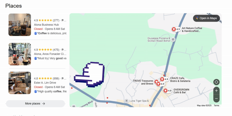 What you’re seeing here is how local businesses appear on Google Maps when someone searches for something nearby, like “restaurant near me.” The results that show up first usually belong to businesses with strong SEO efforts that keep their online presence functional.